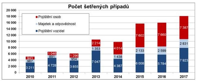 Největší objem podvodně nárokovaných škod, přesahující částku 663 mil. Kč, pak byl odhalen v pojištění majetku a odpovědnosti, kde navíc v roce 2017 došlo meziročně k 9% růstu počtu prověřovaných událostí, a to na 2831 případů.