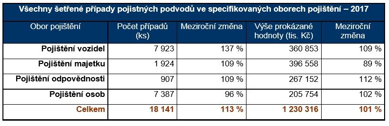 Pojišťovny sdružené v České asociaci pojišťoven (ČAP) prověřily v roce 2017 celkem 18 141 podezřelých pojistných událostí, ve kterých odhalily pojistné podvody v úhrnné hodnotě 1,23 mld. Kč. V roce 2017 převládly odhalené pojistné podvody v oblasti pojištění vozidel, o rok dříve dominovaly podvody u pojištění osob.