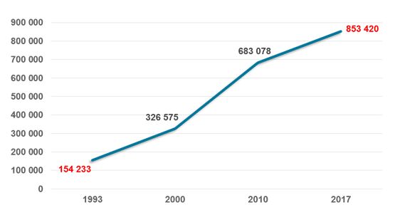 Celkový počet pohybů nad Českou republikou v roce 2017 vzrostl na 853 420. Meziroční nárůst ve srovnání s rokem 2016 činí 2 %(836 619).