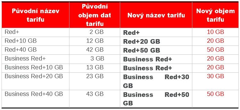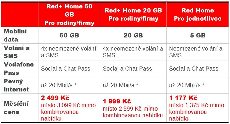V rodinných tarifech Red+ a tarifech Business Red+ Vodafone od 12. února výrazně zvyšuje datové objemy pro nové i stávající zákazníky, a to až šestinásobně. Tarify navíc zákazníci mohou nově zkombinovat v nabídce Red Home a Red+ Home, která zahrnuje mobilní tarify Red Naplno pro jednotlivce a Red+ pro rodiny či firmy, Vodafone Pass a neomezený pevný internet.