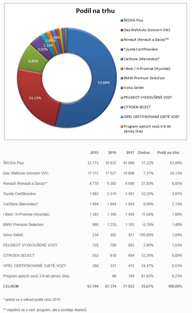 Leaderem v této oblasti je jednoznačně program ŠKODA Plus, který tvoří 54 % celého segmentu ojetin prodávaných v rámci certifikovaných programů. V rámci programu ŠKODA Plus bylo vloni prodáno 41 990 vozidel (17% meziroční nárůst) prostřednictvím 124 prodejních míst. V kategorii tzv. ročních vozů (do 18 měsíců od data první registrace) činil nárůst dokonce téměř 23 % (prodáno 15 697 kusů). To mimo jiné potvrzuje trend preference kvalitních ojetých vozů s jasným původem, doložitelnou servisní historií, v dobrém technickém stavu a s malým počtem najetých kilometrů.