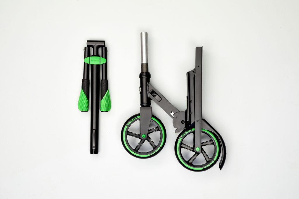 Patentovaný ‚Simply Clever‘ skládací mechanismus koloběžky je typickým prvkem pro značku ŠKODA. Umožňuje totiž její umístění pod podlahou zavazadelníku modelů ŠKODA OCTAVIA a ŠKODA SUPERB, aniž by tím došlo k omezení využitelného objemu zavazadlového prostoru. Díky novému uspořádání úložného prostoru se složená koloběžka bez problémů vejde pod podlahu zavazadlového prostoru nad náhradní kolo, vedle klíče na kola, zvedáku, boxu s nářadím a sady náhradních žárovek. Ve složeném stavu měří koloběžka pouze 41 centimetrů na výšku a 48 centimetrů na délku.