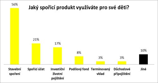 Jako nejčastější formu spoření pro děti uvedlo 56 procent dotazovaných stavební spoření, zatímco na spořicí účet v bance či investiční životní spoření svým dětem odkládá jen 21, respektive 17 procent rodičů. Podíl spoření ve formě terminovaných vkladů, podílových fondů a dalších bankovních produktů činí jen jednotky procent.