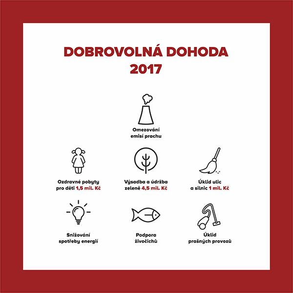 Dohoda definuje závazky hutní firmy, jimiž se snaží zmírnit negativní vliv průmyslové činnosti na životní prostředí nad rámec zákonných požadavků a platných povolení. „Naše technologie již dnes plní nejpřísnější limity emisí prachu a dalších látek. Koncentrace vypouštěných emisí prachu z jednotlivých zdrojů se pohybují v řádech jednotek miligramů na metr krychlový. Během uplynulých 4 let jsme snížili emise prachu o více než dvě třetiny,“ konstatuje výrobní ředitel společnosti Česlav Marek. Například na nejprašnějších spékacích pásech aglomerace byla za rok 2017 dosažena na výstupu z tkaninových filtrů průměrná koncentrace tuhých znečišťujících látek ve výši pouhých 3 miligramů na m3.