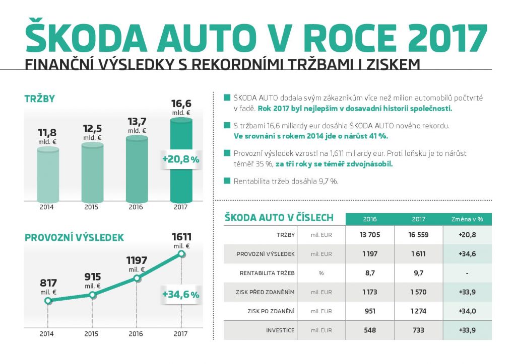 Klaus-Dieter Schürmann, člen představenstva společnosti ŠKODA AUTO za oblast financí a IT, k tomu dodává: „V obchodním roce 2017 jsme opět navýšili počty dodaných vozů a zároveň jsme dosáhli vysokého vytížení našich výrobních závodů. V kombinaci s atraktivním modelovým mixem a optimalizovanými produktovými náklady se nám tak podařilo pokračovat v růstovém ziskovém kurzu. Rekordní provozní výsledek ve výši 1,6 mld. eur (+ 34,6 %) se podařilo zvýšit nadproporcionálně k tržbám (+ 20,8 %), což lze vysvětlit především úspěšnou realizací naší SUV strategie a našimi vylepšenými nákladovými položkami.“