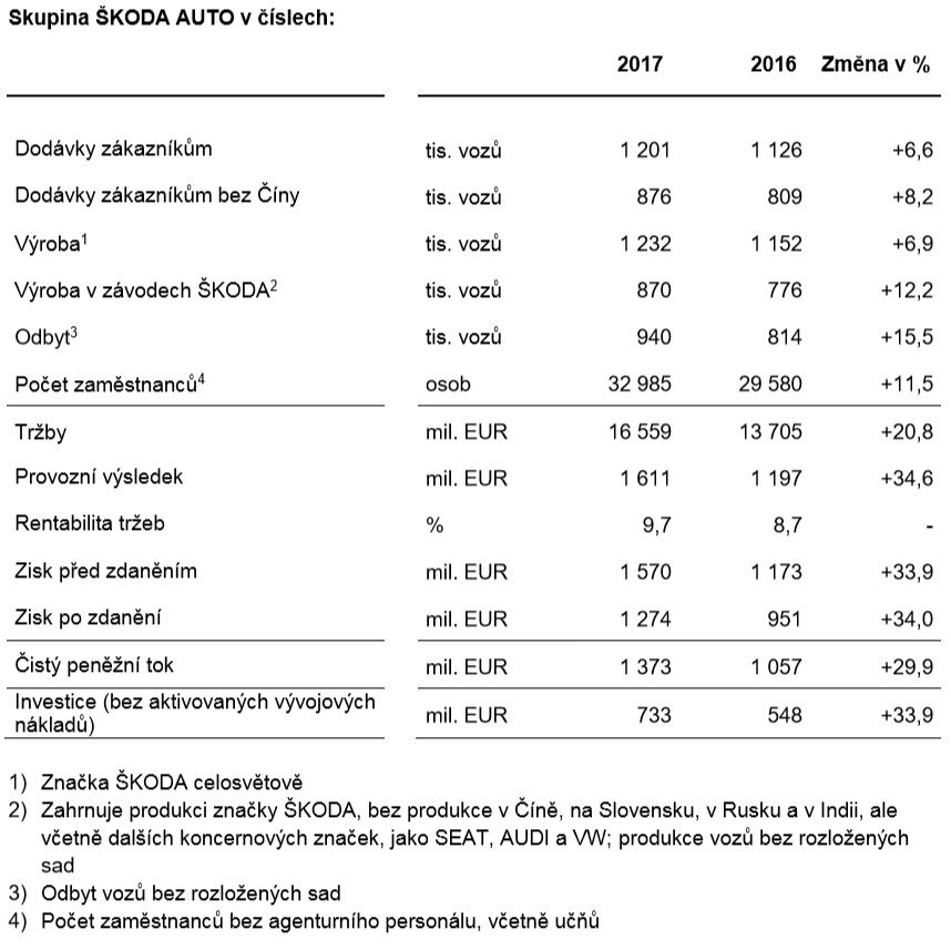 Rok 2017 byl pro společnost ŠKODA AUTO zatím nejúspěšnějším rokem v její dosavadní historii. Česká automobilka dosáhla jak v počtu celosvětově dodaných vozů, tak ve finančních výsledcích nových rekordních hodnot. Ve srovnání s minulým rokem vzrostl počet dodaných vozů o 6,6 % na 1 200 500 vozů (2016: 1 126 500). Společnost ŠKODA AUTO tak dosáhla nejúspěšnějšího roku ve své dosavadní historii. Ve stejném období vzrostly tržby o 20,8 % na 16,6 miliardy eur (2016: 13,7 miliardy eur) a tím dosáhly rovněž nového maxima. Provozní výsledek tradiční české automobilky vzrostl o 34,6 % na 1,6 miliardy eur (2016: 1,2 miliardy eur). Společnost vytvořila prostřednictvím své Strategie 2025 a s ní spojené modelové ofenzívy podmínky pro další růst. V příštích dvou letech uvede společnost ŠKODA AUTO na trh celkem 19 nových vozů, mezi nimi již v roce 2019 sériovou verzi studie ŠKODA VISION X, která slavila na Mezinárodním autosalonu v Ženevě v roce 2018 svou světovou premiéru.