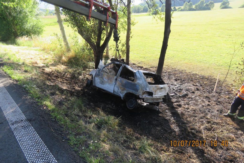 Přední část vozu byla už v plamenech. Lukáši Boudovi se naštěstí podařilo pás přeříznout a včas dostat ženu do bezpečí: „Ptal jsem se jí, jestli v autě není ještě někdo, pro jistotu jsem to zkontroloval. Další řidič mi pomohl řidičku vytáhnout bočním okénkem ven. Položili jsme ji na louku. Komunikovala, měla zranění na hlavě a na rameni,” popisuje. Automobil vzápětí celý vzplál.