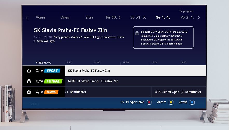 Na co se můžou uživatelé HbbTV aplikace televize Prima těšit? O2 TV Sport jim nabídne například exkluzivní přenosy z prestižní Ligy mistrů, nejlepší zápasy z české nejvyšší fotbalové soutěže nebo kompletní tenisový okruh WTA. Hned v neděli 1. dubna od 18.00 hodin tak diváci mohou například sledovat v rámci O2 TV Sport Na den šlágr české nejvyšší fotbalové soutěže mezi Slavií Praha a FC Fastav Zlín.