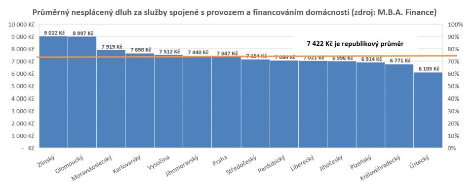 Češi loni dlužili po splatnosti za služby spojené s provozem a financováním domácnosti v průměru 7422 korun. „Očekáváme, že letos částka poklesne, novou průměrnou částku budeme znát koncem května,“ říká Jakub Zetek. Dluhy spojené s provozem a financováním domácnosti nezvládají splácet hlavně dlužníci z Ústeckého, Karlovarského a Libereckého kraje. Naopak nejméně se do problémů se splácením dluhů dostávají lidé ze Zlínska, Vysočiny a Olomouckého kraje (viz grafy v příloze).