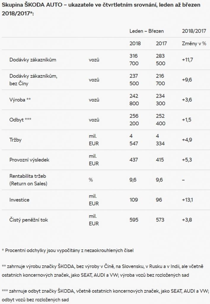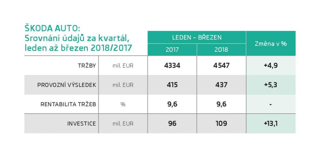 V prvním čtvrtletí roku 2018 se tržby společnosti ŠKODA AUTO zvýšily o 4,9 % na 4,547 miliardy eur (první čtvrtletí roku 2017: 4,334 miliardy eur). Provozní výsledek se zvýšil o 5,3 % na 437 milionů eur (první čtvrtletí roku 2017: 415 milionů eur). Rentabilita tržeb (Return on Sales) činí v současné době 9,6 %.