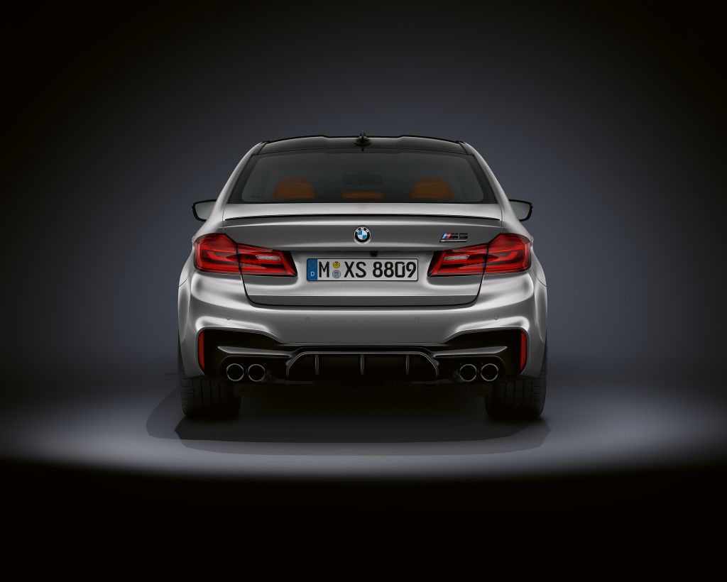 Leskle černé designové téma do přední části nového BMW M5 Competition přináší rámeček masky chladiče v tomto provedení a ti, co pojedou vzadu, mohou nový model rozpoznat podle leskle černých detailů v zadním nárazníku. Tento prvek tvoří barevně sladěnou kompozici s chromově černými koncovkami výfuku. Zadní spoiler a logo M5 na víku zavazadlového prostoru, k němuž přibyl nápis „Competition“, je vyvedeno také v leskle černém provedení.