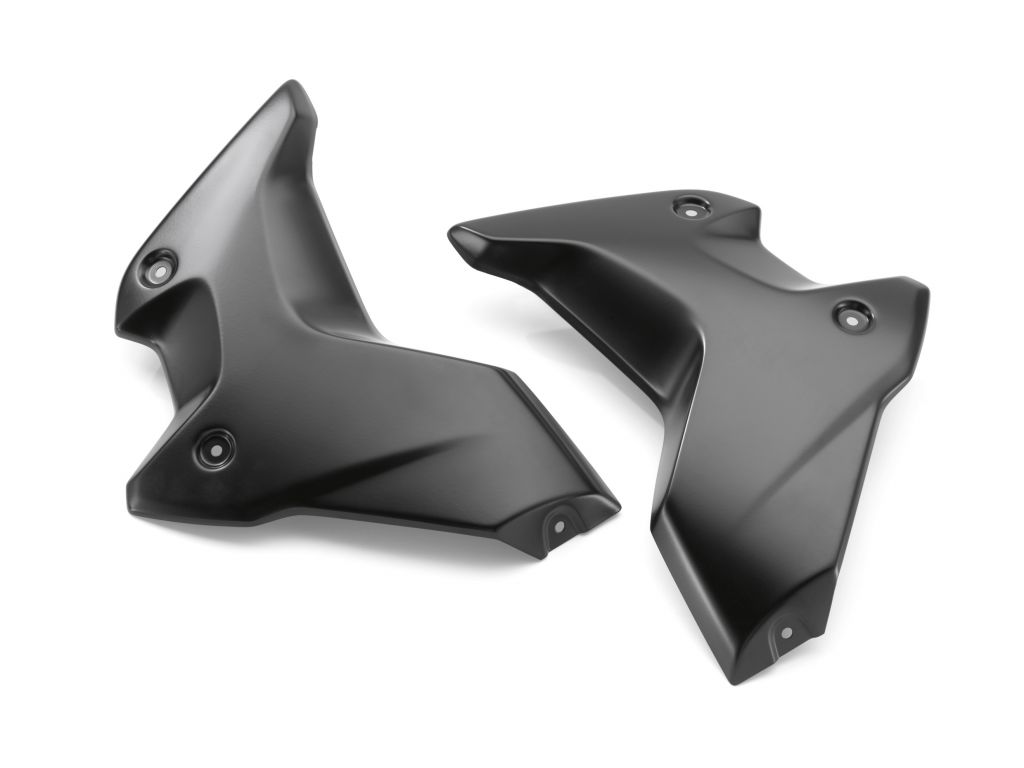 Tyto kryty chladičů jsou vyrobené z černě lakované nereznoucí oceli. Jsou připevněné ke kapotáži motocyklu a posilují jeho sportovně svalnatý vzhled. Kryty chladičů „Style“ v černém provedení odpovídají dílům na sériových modelech Rallye a Exclusive, jsou proto vhodné pouze pro odpovídající modely.