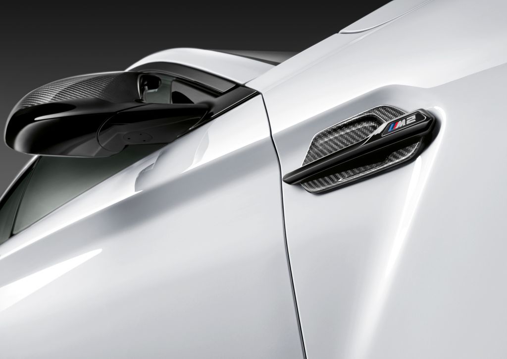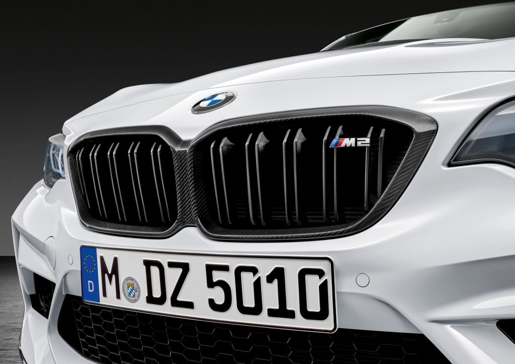 K dispozici je široká nabídka dílů BMW M Performance Parts, které ještě více vizuálně zdůrazní koncentrovanou sílu a aerodynamické kvality BMW M2 Competition. Díly z uhlíkových kompozitů jsou převážně vyráběny ručně a ještě více zvyšují vysoce kvalitní a sportovní vzhled vozu. Všechny tyto díly byly vyvinuty speciálně pro BMW M2 Competition a jsou již typově schváleny. Nevyžadují žádný další záznam do technického průkazu vozu. V nabídce jsou tyto díly M Performance Parts: karbonový nástavec předního nárazníku, karbonový rámeček masky chladiče, boční karbonové průduchy Air Breather (vlevo i vpravo), karbonové krytky zrcátek, karbonové nástavce prahů, karbonové prahové lišty, karbonový zadní difuzor, karbonový zadní spoiler. Dokonce i kryt motoru M Performance pod kapotou je vyroben z tohoto vysoce kvalitního materiálu z uhlíkových vláken. Několikavrstvý lak a leštěný povrch mu dodávají unikátní vzhled. V nabídce je také zadní spoiler M Performance z uhlíkových vláken. Polep M Performance Motorsport je ideálním doplňkem k dílům z uhlíkových vláken a je k dispozici v charakteristických M barvách.