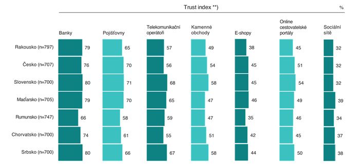 Když už osobní data s firmami sdílí, s nejmenšími obavami je Češi svěří bankám (76 %) a pojišťovnám (70 %). Naopak v bezpečnost sdílení osobních dat na sociálních sítích věří pouze 32 % Čechů. To se odráží i v důvěru vůči konkrétním institucím. S Českou spořitelnou je podle průzkumu IMAS ochotno sdílet osobní data 69 procent respondentů, zatímco s Facebookem pouze 32 % lidí.