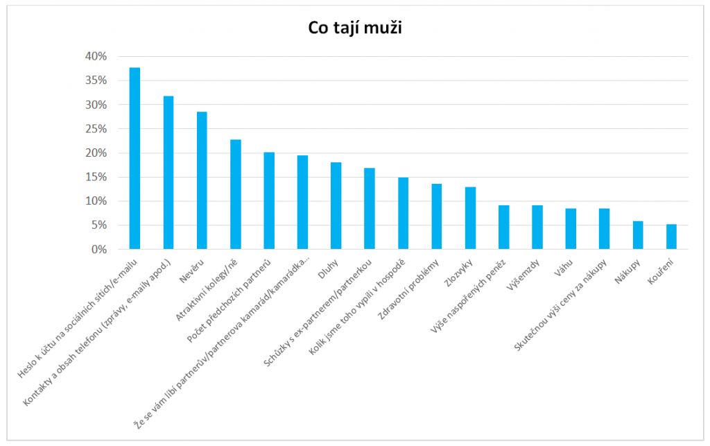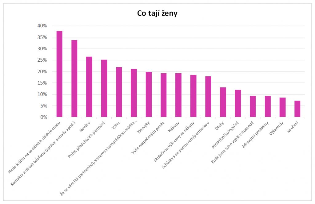 Kromě obsahu telefonu a hesel k sociálním sítím nejčastěji skrývají muži i ženy další společné tajemství – nevěru. Tu skrývá před drahou polovičkou každá čtvrtá žena a každý třetí muž. Každá čtvrtá žena také tají počet předchozích partnerů. Muži doma naopak tají atraktivní kolegyně v práci (23 %). Více než pětina žen si také nechává pro sebe svoji váhu, téměř každý pátý muž zase nemluví o svých schůzkách s ex-partnerem. Rozdílná tajemství mají muži i ženy v oblasti financí. Zatímco ženy tají výši svých úspor (19 %), nákupy a jejich skutečnou cenu (19 %), muži naopak před partnerkami tají dluhy, ať již u bank nebo u jiných finančních institucí nebo u příbuzných, známých či u kamarádů (celkem 19 %).