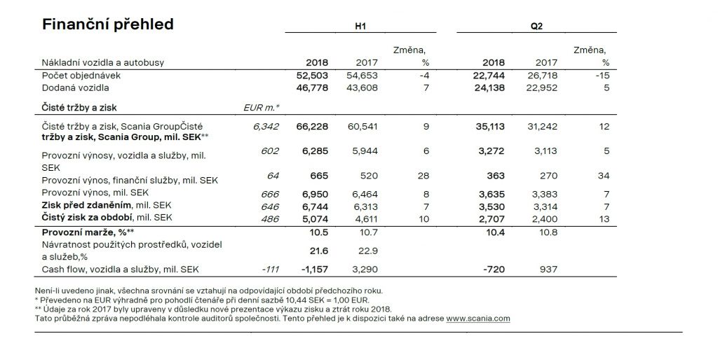 Komentář Henrika Henrikssona, prezidenta a generálního ředitele: "Společnost Scania zvýšila čistý prodej na rekordních 66,2 miliardy Švédských korun v prvních šesti měsících roku 2018, což ve srovnání s předchozím rokem představuje nárůst o 9 procent. Zisk dosáhl 6 950 mld. SEK, což znamenalo provozní marži 10,5 procent. Zatímco vyšší objem prodaných vozidel a služeb měl na zisk pozitivní vliv, stejně tak kurz Švédské koruny, negativní dopad měly naopak faktory v podobě méně příznivého tržního mixu, vyšší náklady na výrobu dvou produktových řad a pokračující potíže na straně dodavatelů. Nedávná napjatá situace v dodavatelském řetězci se ještě zhoršila kvůli stávce u dodavatele komponentů, což mělo za následek, že společnost Scania byla nucena dočasně zastavit dodávky a prodej motorů V8. V důsledku těchto přerušení se také zvýšila úroveň skladových zásob, což mělo také v kombinaci s vysokou úrovní investic negativní dopad na peněžní tok.