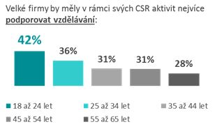 Zároveň se také mění pohled na to, co to vlastně společenská odpovědnost je. Podle zaměstnanců by firmy měly podporovat hlavně ochranu životního prostředí a férové chování ke svým zaměstnancům. Tyto oblasti se dlouhodobě umísťují na prvních dvou pozicích. Pomalu je nicméně začíná dohánět vzdělávání, které by měly velké firmy podporovat ze všeho nejvíce podle 42 % zaměstnanců do 24 let. „Firmy by si ovšem v první řadě měly uvědomit, že aktivity na poli CSR mají mít souvislost s povahou či oblastí jejich podnikání. V opačném případě postrádají smysl,“ upozorňuje Poucha.