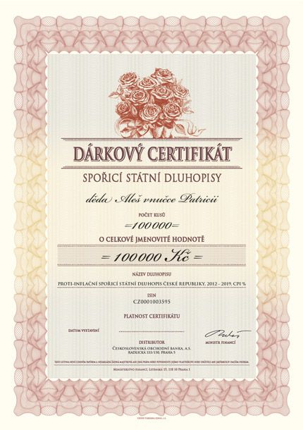 Darovat lze hned několik tipů dluhopisů – diskontovaný spořící státní dluhopis, prémiový spořící státní dluhopis, kuponový státní dluhopis, reinvestiční spořící státní dluhopis, variabilní spořící státní dluhopis nebo proti-inflační spořící státní dluhopis. Všechny mají stejnou jmenovitou hodnotu 1 Kč a minimální počet zakoupených kusů činí 1 000. V překladu to znamená, že minimální hodnota vašeho dárku bude tedy 1 000 Kč, plus administrativní poplatek 250 Kč za zpracování Žádosti o provedení darování. Pro účely darování nicméně doporučujeme zvolit prémiový spoříc státní dluhopis s pevně daným úrokem a splatností 3 roky, kdy v posledním roce investor obdrží tzv. prémiový – vyšší výnos. Na certifikát je také možno umístit krátké věnování.
