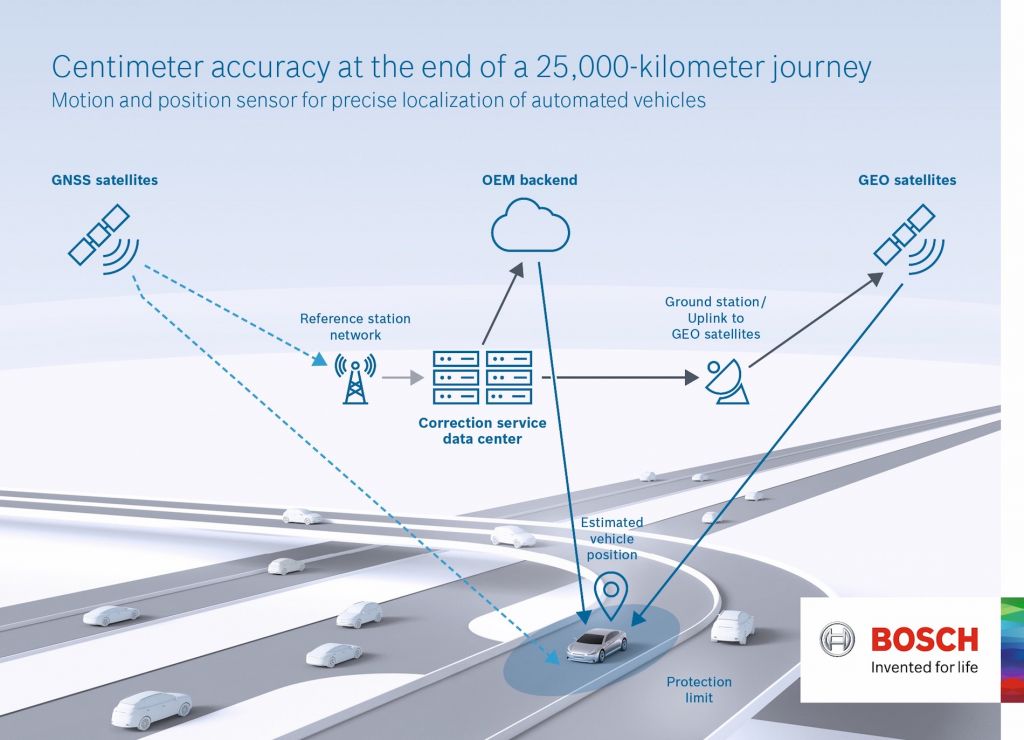 Společnost Bosch vyvinula senzor, který umožňuje automatizovaným vozidlům přesně určit jejich polohu: pohybový a polohový senzor. Ten disponuje mimo jiné také vysoce výkonnou přijímací jednotkou signálů Globálního satelitního navigačního systému (GNSS = Global Navigation Satellite System). To je nezbytné ke stanovení absolutní polohy automatizovaného automobilu. Výzva určování polohy pomocí satelitů spočívá v nepřesnosti dat. Satelity GNSS létají po svých drahách ve vzdálenosti 25 000 kilometrů od Země rychlostí 4 000 metrů za sekundu. Jejich signály na cestě k Zemi zkresluje například ionosféra nebo vrstvy mraků v troposféře, což může vést k nepřesnosti dat. Pro současné navigační systémy to sice stačí, ale pro automatizované řízení už je to málo. Z toho důvodu Bosch využívá korekční data od různých poskytovatelů a za tímto účelem v roce 2017 založila s partnery joint venture Sapcorda. Pomocí sítě přesně vyměřených referenčních stanic na Zemi mohou tito poskytovatelé korigovat nepřesnosti informací o poloze GNSS. Do automobilu se data korekce dostanou přes Cloud nebo geostacionární satelity. Vedle signálů GNSS získává pohybový a polohový senzor další informace: díky senzorům počtu otáček kola a senzoru úhlu natočení, které jsou podobné lidskému hmatovému smyslu, rozpozná, kam a jakou rychlostí auto jede. Senzory počtu otáček kola a senzor úhlu natočení jsou něco jako hmatový smysl u člověka. Pohybový a polohový senzor navíc disponuje integrovanou inerciální senzorikou – srovnatelnou s lidským orgánem rovnováhy. Stejně jako se lidé mohou pohybovat pomocí smyslu pro hmat a rovnováhu, ví senzor naprosto přesně, kde a kam se vozidlo pohybuje.