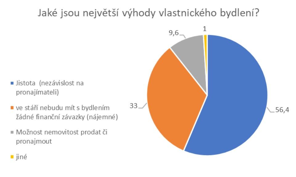 Na vlastnickém bydlení považují lidé za nejdůležitější jistotu (nezávislost na pronajímateli) v 56,4 procentech. Třetina lidí (33 procent) hodnotí kladně to, že díky vlastnímu bytu nebudou mít ve stáří s bydlením finanční starosti. Možnost nemovitost kdykoli prodat je důležitá pro necelých deset procent oslovených.