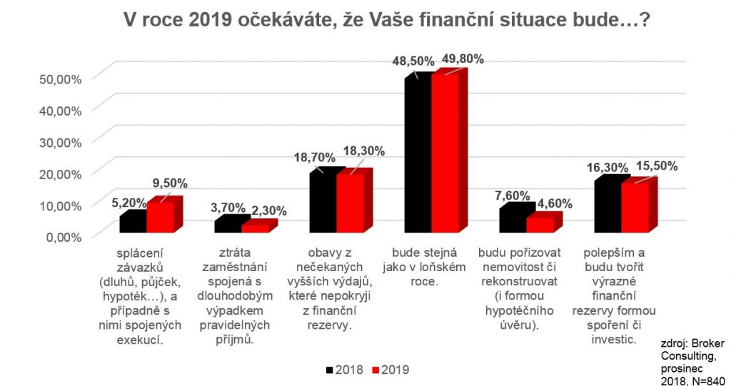 Pro rok 2019 se očekávání Čechů v oblasti celkové finanční situace oproti loňskému roku výrazně neliší. Mírně poklesly obavy ze ztráty zaměstnání, ale naopak se zvýšil strach lidí ze splácení závazků a případných exekucí.