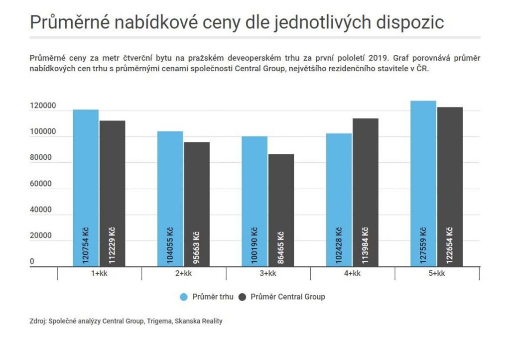 Rozdíl u průměrného bytu této dispozice tak může dosáhnout i víc než milionu korun, kdy průměrná cena u Central Group vychází na 7 330 000 Kč. Za metr čtvereční tak zákazník největšího rezidenčního stavitele v ČR zaplatí v průměru 86 465 Kč. Nejčastěji tyto byty kupují lidé ve věku okolo 40 let, zejména páry. Přibližně třetina z nich je financuje pomocí hypotečního úvěru.