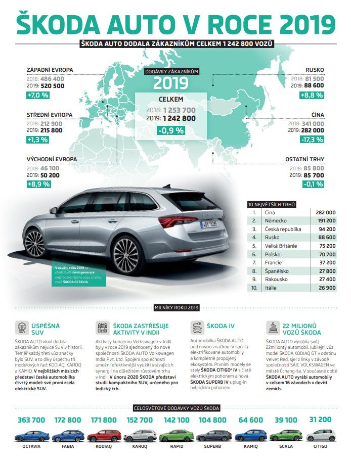 Hlavním důvodem je i nadále klesající celkový trh s osobními vozy v Číně. Na ostatních trzích zvýšila ŠKODA své dodávky zákazníkům o 5,3 % na 960 700 vozů. V Evropě (+5,8 %) a Rusku (+8,8 %) zaznamenala automobilka další rekordní rok. V prosinci zvýšila ŠKODA AUTO své dodávky zákazníkům na celém světě na 114 700 vozů a zaznamenala tak nárůst o 9,1 %. V roce 2020 vstoupí na trhy čtvrtá generace modelu OCTAVIA, kromě toho bude zahájena také sériová výroba prvního vozu na bázi modulární elektrifikované platformy (MEB).
