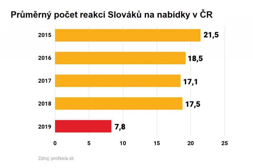 Jedna pracovní nabídka v České republice zaujala minulý rok necelých osm uchazečů ze Slovenska. Analýza největšího pracovního portálu na Slovensku Profesia.sk dokazuje, že zájem Slováků o práci za českými hranicemi výrazně klesl. Průměrný počet reakcí Slováků na nabídku práce v ČR se meziročně snížil téměř o 10 uchazečů. Ještě v roce 2018 zareagovalo na jeden inzerát v ČR téměř 18 lidí. Nyní je zájem nejnižší za posledních 5 let.