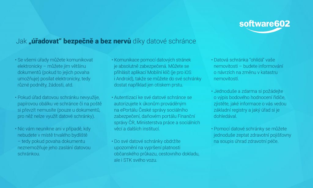 „Poštovní datová zpráva je v podstatě elektronickou alternativou listovní zásilky, jejíž odeslání a doručení se obejde bez jakéhokoli fyzického kontaktu s dalšími lidmi. Eliminuje tak jakékoli riziko nákazy novým typem koronaviru,“ říká Martin Vondrouš, expert pro zavádění nových technologií ze společnosti Software602, která zajišťuje bezproblémový provoz ISDS. Prostřednictvím datových schránek tak je možné bezplatně zasílat faktury, smlouvy, objednávky, ale i různá potvrzení a další dokumenty, u nichž je třeba ověřit identitu odesílatele.