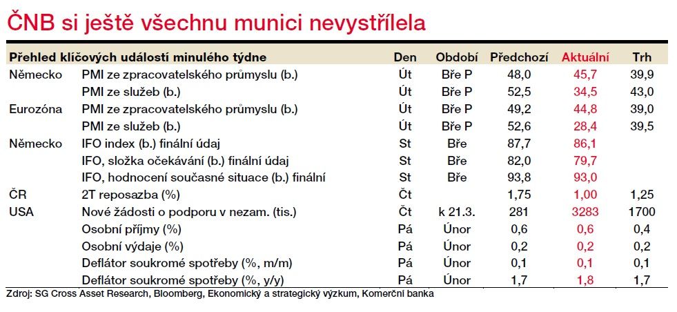 Fiskální i měnové politiky ruku v ruce přicházely i minulý týden s masivními opatřeními, jejichž razance často překonávala očekávání. Finanční trhy sice zůstaly volatilní, snaha hledat dna na globálních akciových trzích byla markantní. Klíčové nyní budou rychlost a detaily implementace opatření, zejména na straně vlád. Ekonomický kalendář začíná postupně nabízet data ovlivněná pandemií COVID-19. Zatímco březnový PMI z Číny se po únorovém propadu odrazí zpět nad 50 bodů, březnové indikátory důvěry z Evropy i čísla z německého či amerického trhu práce budou naopak prvními, které ukáží v těchto regionech první ekonomické dopady pandemie.