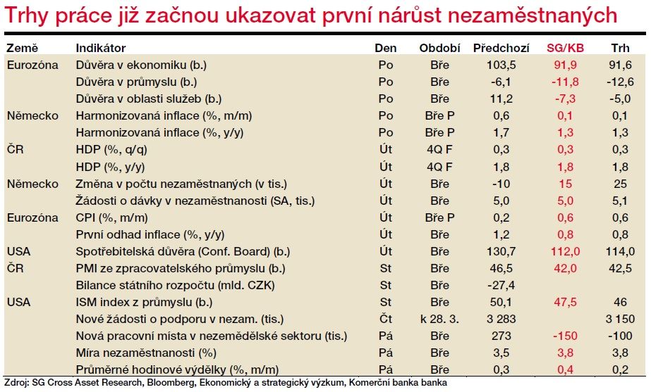 Závěr tohoto týdne přinese kompletní březnovou statistiku z amerického trhu práce. Nejistota je velká. Bude záležet, v které části března se sběr dat převážně uskutečnil. Každopádně, březen je pouze začátek, dubnová čísla budou mnohem horší. Ať tak či tak, volná pracovní místa mizí v USA pod rukama, nezaměstnanost půjde nahoru. První významnější nárůst nezaměstnaných bude oznámen i v Německu. Dnes publikované indikátory důvěry eurozóny z dílny Evropské komise navážou na kolaps již zveřejněných PMI, zajímavá budou i inflační data. Výrazný pokles cen pohonných hmot by se měl podepsat na poklesu inflace (z únorových 1,2 % y/y na 0,8 % y/y). O desetinu procentního bodu na 1,1 % by měla zpomalit meziroční dynamika jádrové inflace. Pokud se ale Eurostat rozhodne odstranit ze spotřebitelského koše položky, které nejsou kvůli pandemii koronaviru k dispozici, jádrová inflace může naopak zrychlit. Neznámou jsou též položky, které mohou kvůli koronaviru, přerušeným výrobním řetězcům a dodávkám zejména z Číny zdražit.