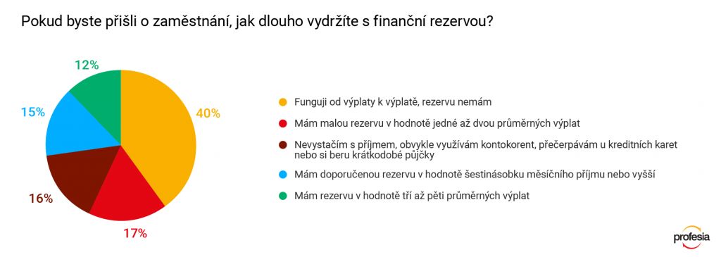 Současná situace nás poučila o tom, že i když si jsme jistí, že o práci máme postaráno, realita nás může zaskočit. Mít finanční rezervu pro případ, že přijdeme o zdroj příjmu nebo nás postihnou neočekávané velké výdaje je proto důležité. Jak si v tomto ohledu stojíme? Podle výsledků nejnovější ankety na stránkách Profesia.cz více než polovina lidí žádný „finanční polštář“ nemá. 40 % respondentů uvedlo, že fungují od výplaty k výplatě, dalších 16 % dokonce s příjmem nevystačí a využívá kontokorent, kreditní karty nebo krátkodobé půjčky.