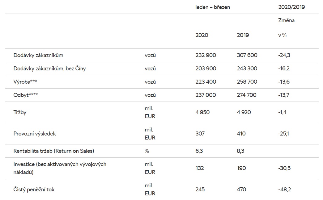 Tento vliv je patrný při pohledu na dodávky zákazníkům: od ledna do března 2020 dodala česká automobilka zákazníkům na celém světě celkem 232 900 vozů, což je výrazně méně, než v loňském roce (první čtvrtletí 2019: 307 600 vozů; -24,3 %). Navzdory této složité situaci automobilka dále investuje do své budoucnosti a pokračuje v transformaci od výrobce automobilů k Simply Clever společnosti nabízející nejlepší řešení mobility.
