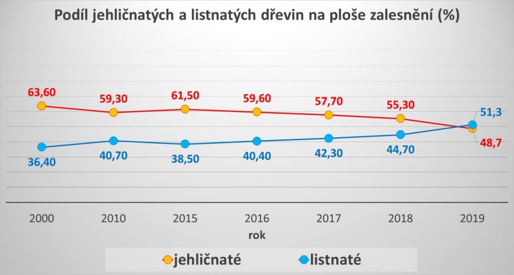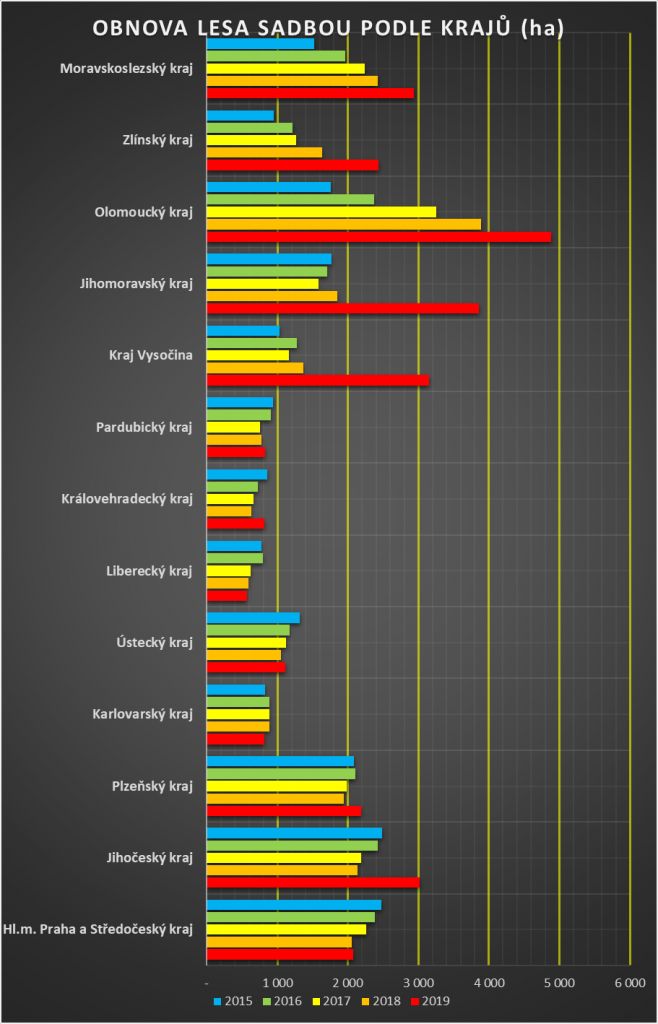 Podíl listnatých dřevin při obnově lesů v ČR se neustále zvyšuje. V roce 2019 lesníci znovu zalesnili rekordně vysokou plochu kalamitních holin. Loni vysázeli lesníci rekordních 111,6 milionu listnáčů, zatímco smrků bylo 36,1 milionu sazenic (v roce 2018 bylo vysázeno 74 milionů listnáčů a 33 milionů smrků). Sadba činila více než 28 tisíc hektarů. Včetně využití přirozené obnovy se celkem podařilo obnovit takřka 34 tisíc hektarů lesů, což bylo nejvíce v historii samostatné ČR.