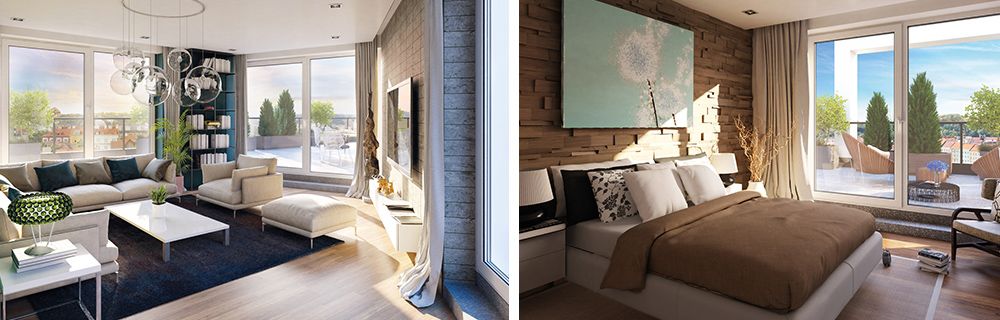 Provedení bytů zahrnuje dřevěné podlahy, posuvné dveře nebo hliníková okna s trojskly a nechybí luxusní koupelny. Ve všech místnostech je podlahové vytápění. Moderní systém rekuperace zajišťuje přísun čerstvého vzduchu a v létě sníží teplotu v bytě až o šest stupňů Celsia.