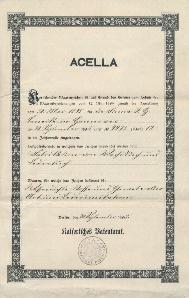 30. května 1895 si společnost, později známá jako Benecke-Kaliko AG, jež je nyní součástí společnosti Continental, nechala u císařského patentového úřadu pro svou nově vyvinutou umělou kůži s nitrocelulózovým potahem zaregistrovat ochrannou známku Acella. Ta byla 30. září zapsána do rejstříku ochranných známek. Díky vyšší odolnosti vůči nízkým teplotám i vůči stárnutí, což jsou vlastnosti, jimiž Acella vyniká dodnes, se odlišovala od do té doby úspěšného voskovaného plátna a koženky ošetřené lněnou fermeží.