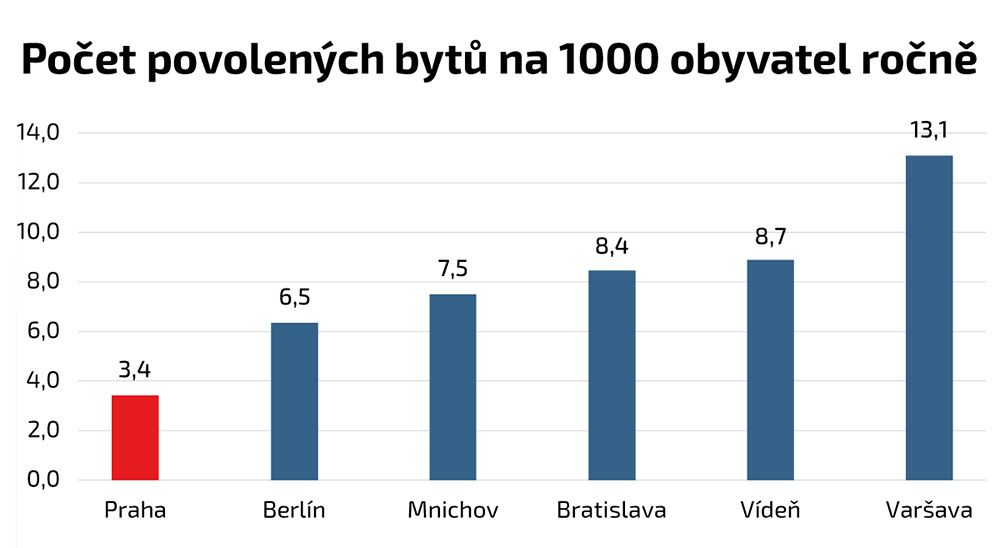 Nových bytů se v Praze povoluje dlouhodobě málo. Průměrně jen 3 byty na 1.000 obyvatel. V sousedních zemích se ve srovnání s Českem povoluje výrazně více. Například v Mnichově, Bratislavě nebo Vídni je to dvakrát až třikrát tolik co v Praze.