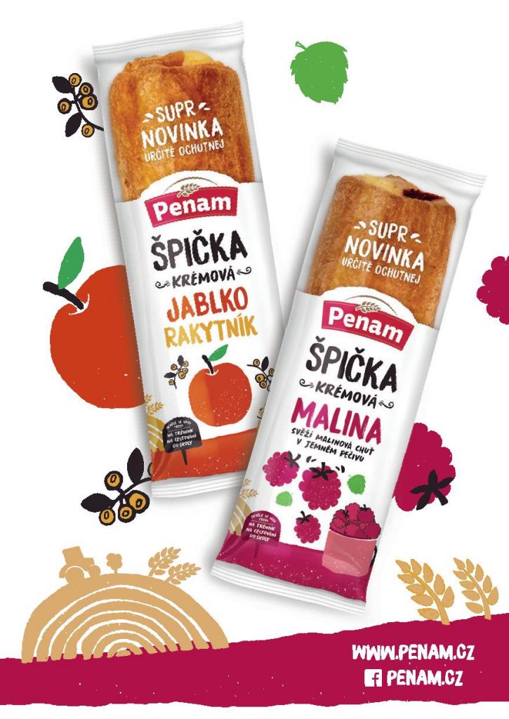 Kombinací jemného plundrového pečiva a nadýchané ovocné krémové náplně se mohou chlubit další dvě nové příchutě sladkých špiček, které doplňují trio produktových novinek. „Cílíme na konzumenty, pro něž je zásadní chuť výrobku. I proto sázíme na klasiku v podobě malinové příchutě anebo momentálně velmi populárního rakytníku zjemněného jablkem,“ vysvětluje produktovou koncepci Martin Dolský z Penamu.