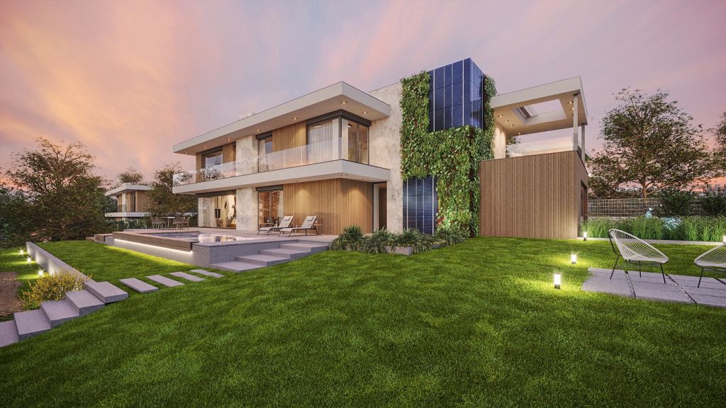 Exkluzivní developerský projekt Na Meandru v sobě zahrnuje ekologicky šetrné a energeticky soběstačné domy. Ohled na životní prostředí a úsporu zajišťuje už samo architektonické řešení, které začlenilo prvky jako zelené stěny a fotovoltaické panely na střechách i na stěnách vil.