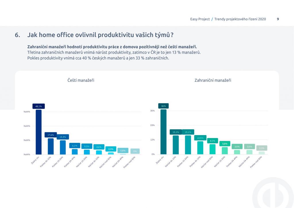 Česká společnost Easy Software, která dodává vlastní softwarová řešení na řízení projektů do 26 zemí světa, oslovila české a zahraniční projektové manažery z více než 250 firem napříč segmenty s hodnocením loňského „covidového” roku. Průzkum s názvem „Trendy projektového řízení 2020“ odhalil mezi tuzemskými a zahraničními manažery zásadní rozdíly. Mimo jiné v přístupu k odměňování, personální politice, a hlavně k řízení týmu na dálku. To pozitivně či neutrálně hodnotilo 60 % zahraničních projektových manažerů oproti 30 % Čechů. Nechuť tuzemských manažerů ke konceptu home office ale není bez příčiny – na vině je především nižší produktivita.
