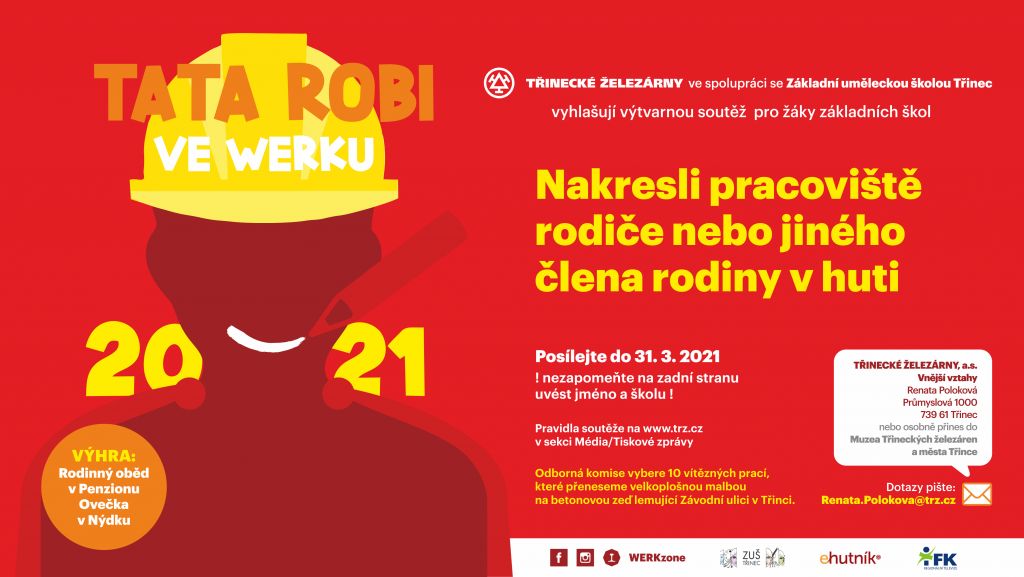 Ztvárnit tatínka, maminku či jiného člena rodiny na jeho pracovišti v areálu Třineckých železáren je úkolem dětí ve výtvarné soutěži nazvané „Tata robi ve werku 2021“. Vyhlašuje ji třinecká huť spolu se Základní uměleckou školou Třinec.