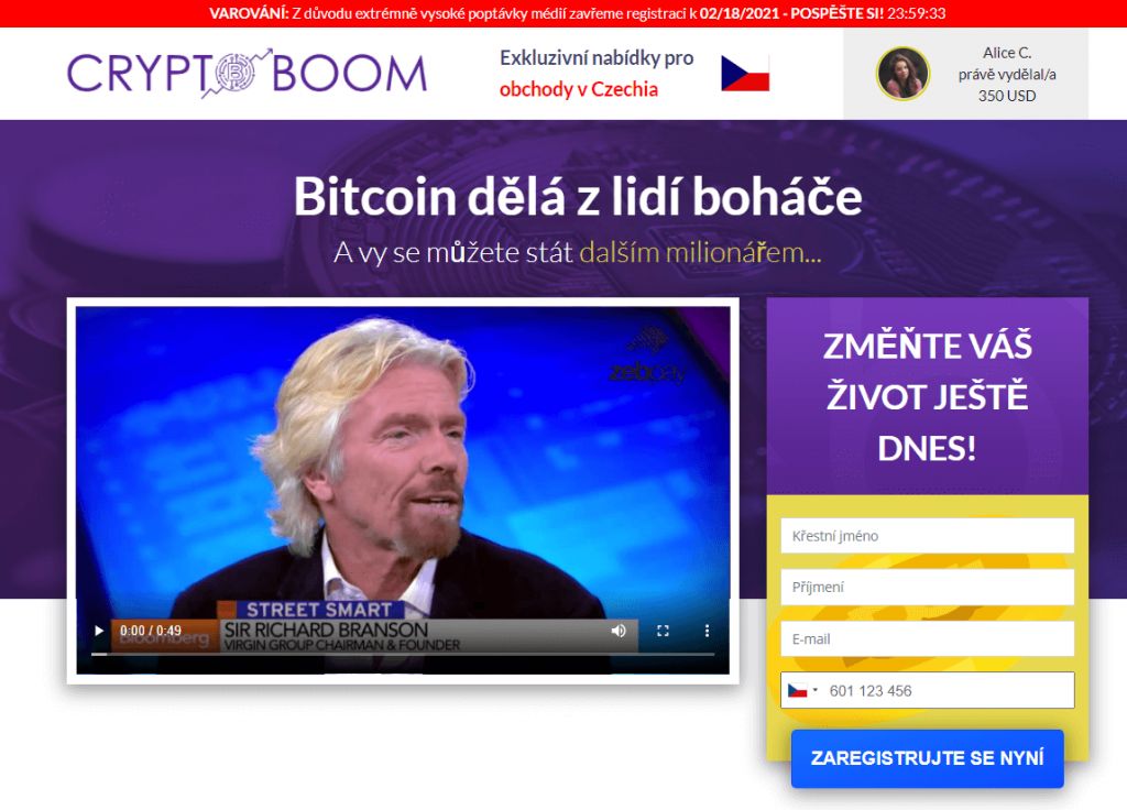 Fiktivní zpravodajský článek vede uživatele k prokliknutí na cílovou stránku s přihlášením do investičního nástroje. I tato stránka obsahuje video, kde bitcoin popisuje Bill Gates či Richard Branson, oba známí světoví multimilionáři.