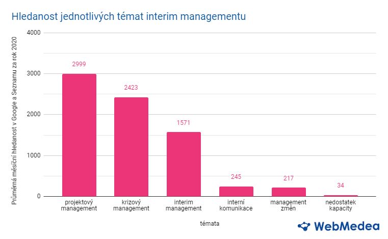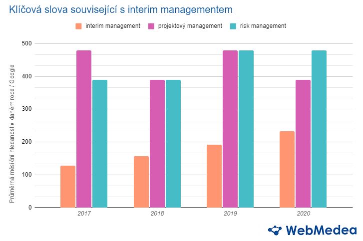 Data společnosti WebMedea services ukazují až 30% nárůst hledanosti pojmu interim management v meziročním srovnání na českém internetu, což poukazuje na zvyšující se potenciál interim managementu. Data jsou sledována v horizontu čtyř let – od roku 2017 až do roku 2020.