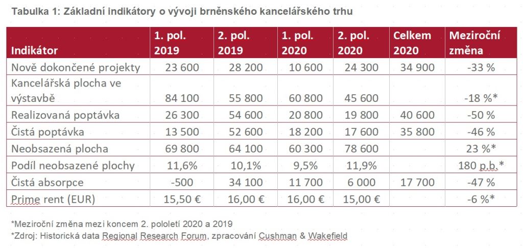 Hrubá realizovaná poptávka (včetně renegociací – tj. přejednaných smluv) ve druhém pololetí roku 2020 dosáhla 19 800 metrů čtverečních, což představuje pokles o pět procent v porovnání s předchozím pololetím a o 62 procent v meziročním srovnání. Největší podíl (31 procent) na realizovaném objemu měly pro Brno tradiční IT firmy.