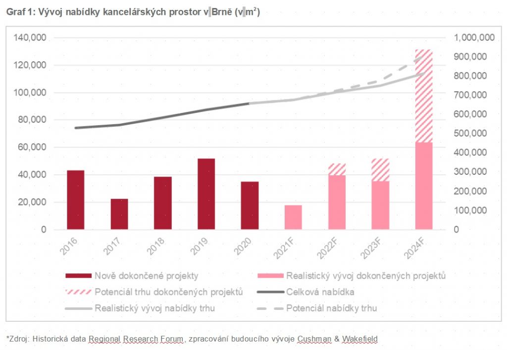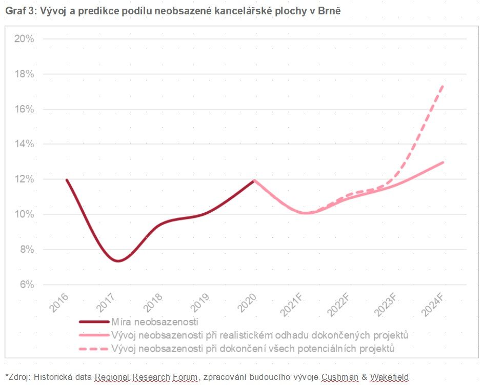 Koncem roku 2020 bylo v Brně volných 78 600 metrů čtverečních moderních kancelářských ploch, čímž se míra neobsazenosti zvýšila na 11,9 procenta. Letos očekáváme, že neobsazenost poklesne přibližně na 10 procent, a to díky malému množství nově dokončených ploch. Do budoucna bude záležet na tom, zda se poptávka zvýší nad dlouhodobý průměr – pokud ne, může neobsazenost do roku 2024 vzrůst i nad 13 procent, teoreticky při vyšší výstavbě až na 17 procent.