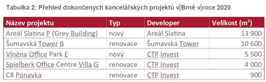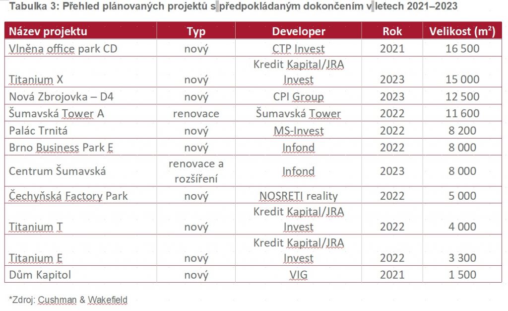 Aktuálně novou výstavbu kancelářských prostor v Brně realizují spíše menší české firmy. Ve výstavbě je osm projektů s celkovou moderní kancelářskou plochou 58 600 metrů čtverečních, z níž by přibližně třetina měla být dokončena letos.