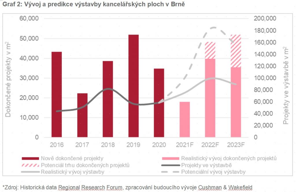 Lukáš Netolický, vedoucí regionálních trhů v České republice, Cushman & Wakefield: „Již nyní však můžeme potvrdit, že do roku 2023 se brněnský kancelářský trh má zvětšit o 13 procent současného objemu. Toto množství by přitom nakonec mohlo být ještě vyšší, neboť některé z projektů plánovaných až na rok 2024 by se mohly – v závislosti na vývoji poptávky, zejména realizovaných předpronájmů, bude-li situace příznivá – začít stavět již dříve, což celkový objem výstavby dále zvýší. Již při minulé krizi se přitom ukázalo, že štěstí přeje připraveným: ti, kdo výstavbu projektů realizovali i během krize, pak v době ekonomického oživení byli ve výhodě.“
