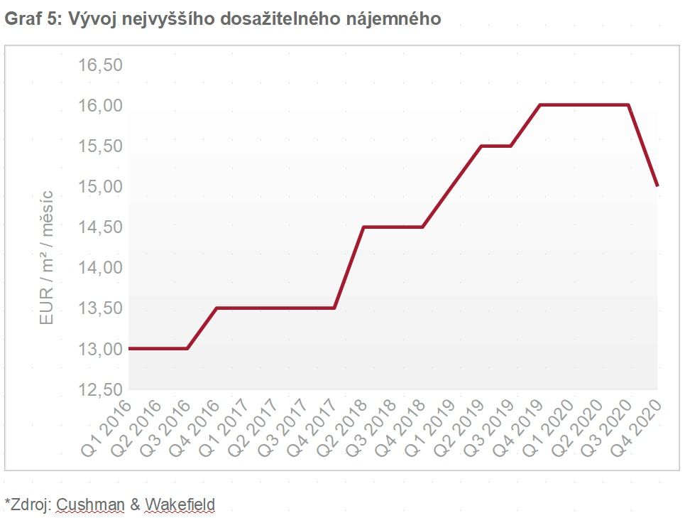 Vliv pandemie se loni projevil i na nejvyšším dosahovaném nájemném na kancelářském trhu v Brně. Zejména v druhé polovině roku byl zřejmý pokles z původních 16 eur na 15 eur za měsíc a metr čtvereční, letos očekáváme další pokles. Původní částka ale byla trochu nadsazená a dlouhodobě neudržitelná, Brno se touto cenou dostalo na špici mezi srovnatelnými zahraničními městy ve střední a východní Evropě.