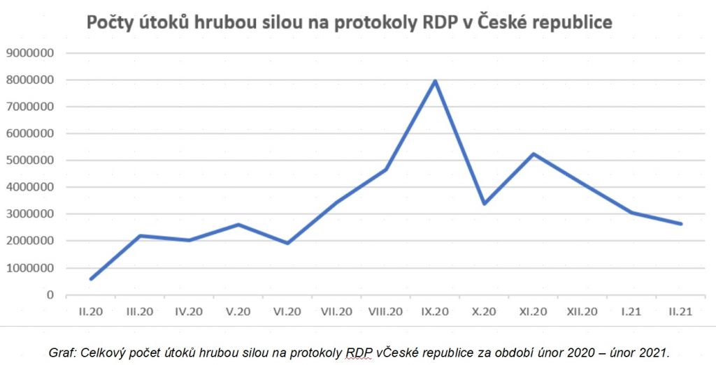 V únoru 2021, tedy necelý rok po začátku pandemie, činilo skóre útoků hrubou silou 377,5 milionů. V meziročním srovnání se zmíněnými 93,1 miliony je to obrovský rozdíl. Výrazný nárůst zaznamenala i Česká republika. Zatímco v únoru 2020, měsíc před zavedením prvních vládních opatření proti šíření koronaviru, zachytil Kaspersky téměř 580 tisíc útoků hrubou silou na protokoly RDP, v únoru 2021 to už bylo přes 2,6 milionu případů, což představuje víc než čtyřnásobný meziroční růst. Vůbec nejvíc případů v tuzemsku bylo loni v říjnu, celkem 7,96 milionu.