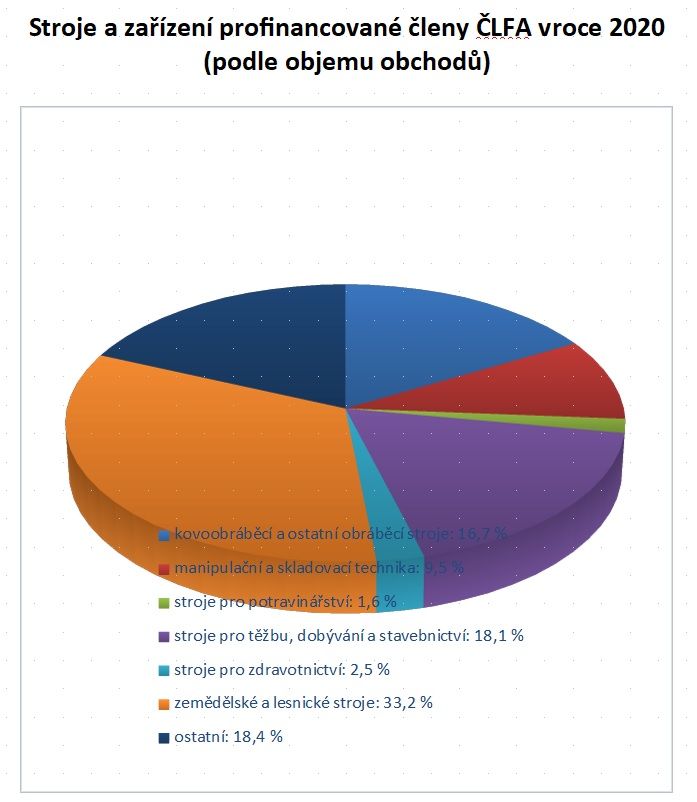 V přehledu komodit financovaných členy ČLFA v roce 2020 ve firemní sféře náleží strojům a zařízením 30% podíl. Nejvíce financí si podnikatelské subjekty loni půjčily na zemědělské a lesnické stroje (8,52 mld. Kč), na stroje pro těžbu, dobývání a stavebnictví (4,63 mld. Kč) a na kovoobráběcí a ostatní obráběcí stroje (4,27 mld. Kč).